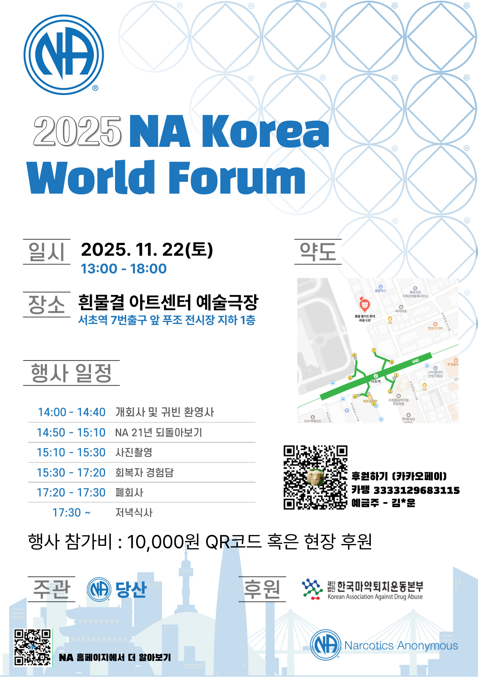 2025 NA World Forum을 알려드립니다. 1년간의 NA 활동을 되돌아보고, 다른 국가의 NA와의 협력을 증진하기 위한 자리이오니 많은 분들의 관심 부탁드립니다. 사전 신청을 링크로 남겨주시면, 저희가 행사를 준비하는데 큰 도움이 됩니다.